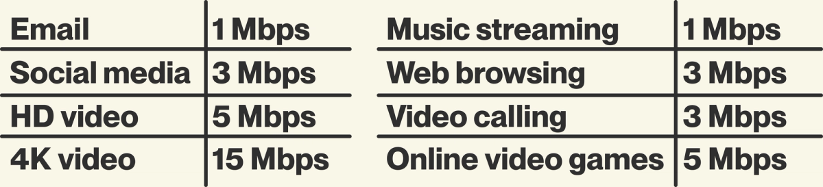 To properly calculate your internet speed needs (aka the water pressure in your home), all you have to do is add up the number of devices that would normally use your internet and the activity that each of them does most often. You can check out the download speeds each of those uses in this very handy table: