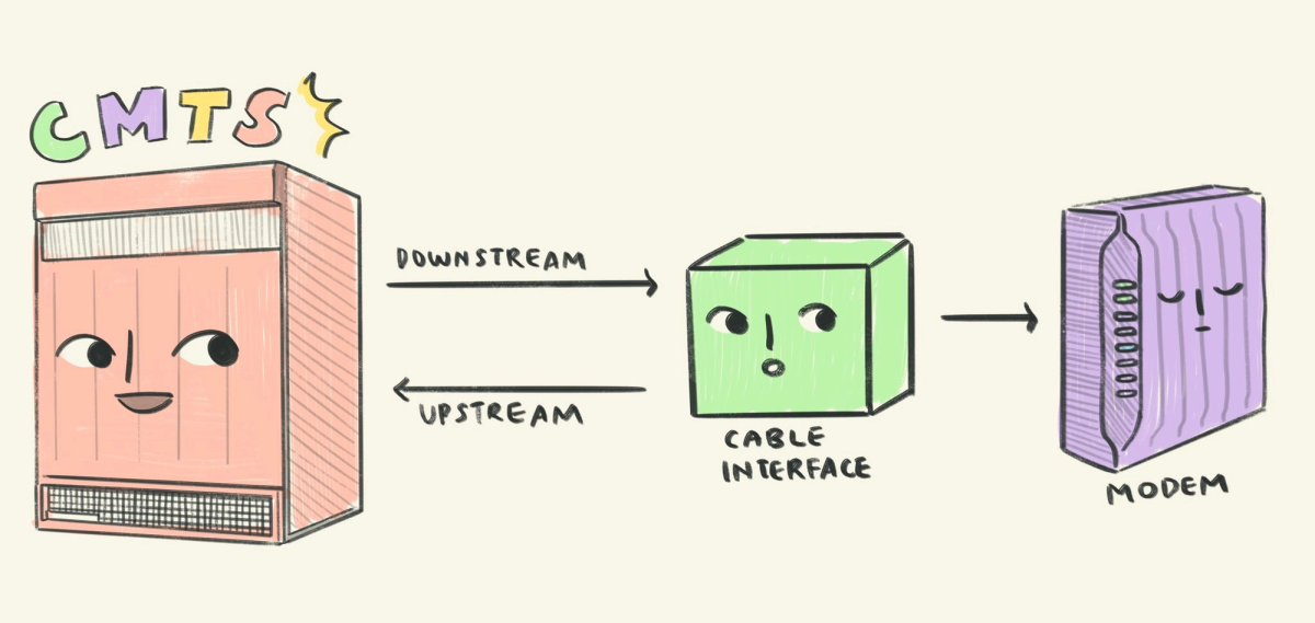 Si les trois analogies n'ont pas suffi à brosser un tableau clair, laissez-moi vous expliquer comment ça fonctionne, du CMTS à votre modem, avec une image. Espérons que le modem se réveille.