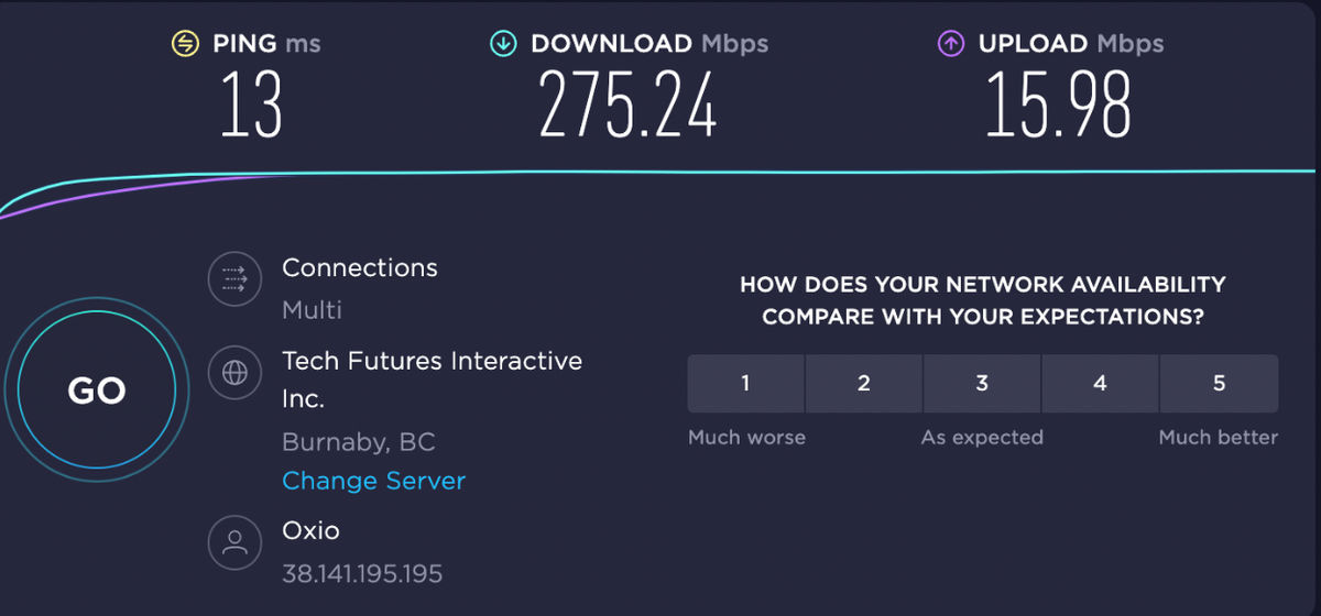 Pour vous donner une idée plus précise, disons que vous êtes comme moi et que vous avez présentement le forfait 300 Mbit/s d’oxio. Je n'ai pas de problème de vitesse notable, mais lorsque j'effectue un test de vitesse sans fil, je reçois un résultat de 275 Mbit/s. Pourquoi ? Ma vitesse est-elle limitée (throttled)?